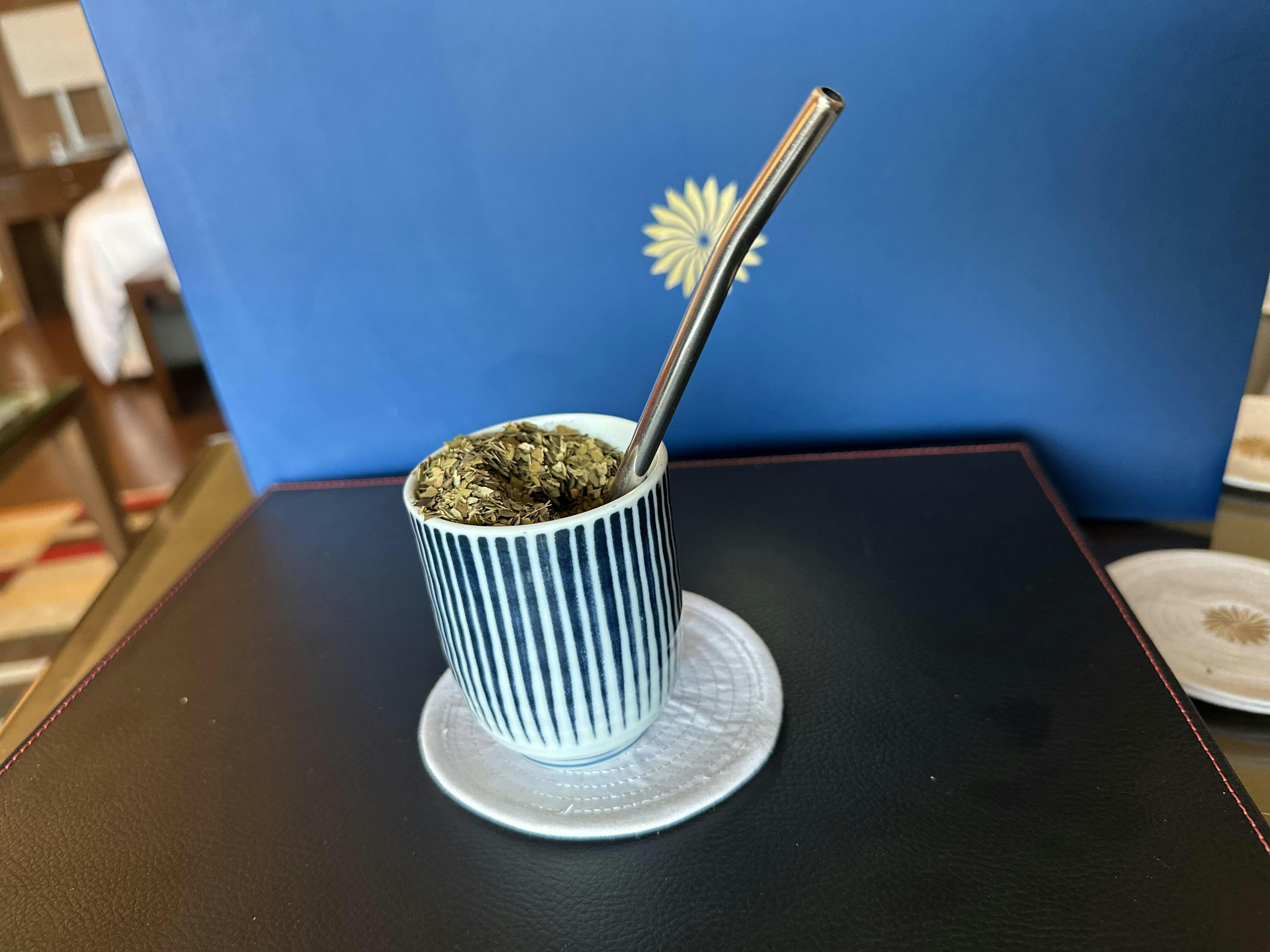 Fill a gourd one-third with Yerba Maté (about 10–15g). Tilt it to create a slope inside. Pour a bit of cool water on the lower side to hydrate the leaves. Insert the bombilla (filter straw) at that angle. Add hot water (80°C) and sip from the straw. Refill as needed - each dose can last up to 500ml.